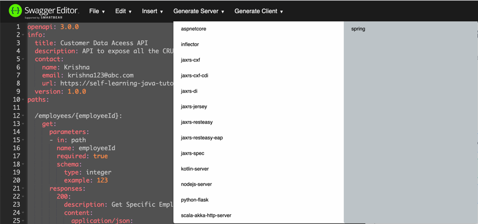 Swagger editor provide tools to generate server stub from the API definition.